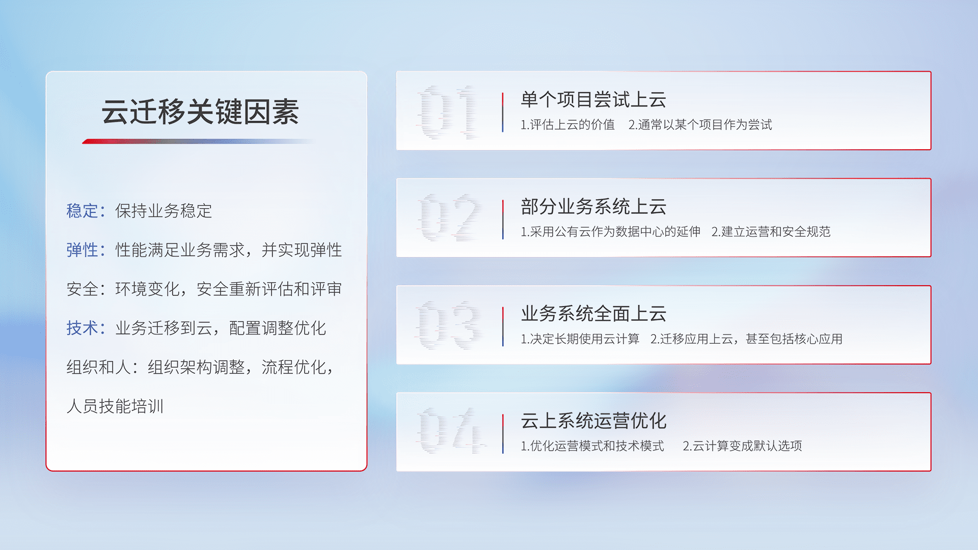 结合实际业务,,,,从规划设计、、、、云平台选型、、云原生改造、、数据迁移、、、、集成交付,,迁移全过程为客户识别最佳上云路径,,,,做好风险识别管理,,,,设计网络架构、、、身份权限、、、、安全审计合规、、操作审计、、日志审计、、、、监控告警策略、、、、多站点容灾设计等,,,,对云上基础设施进行整体规划,,提升IT治理水平,,以满足弹性、、、高可用、、、高性能的需求。。