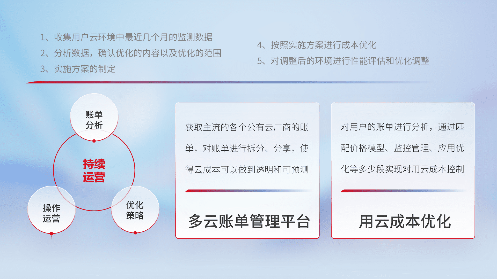 通过多云纳管,,以统一的资源数据模型把客户的云资源进行抽象和封装,,进而实现对多云资源的统一操作,,,保障云资源管理的可靠性、、稳定性与可用性。。。量身定制化运维内容,,,配置、、、开发运维、、、补丁管理、、、、备份、、监控、、、认证和访问管理、、、审计和日常巡检等,,,,保障在用云过程中的可靠度,,,稳定度以及高可用率。。。。